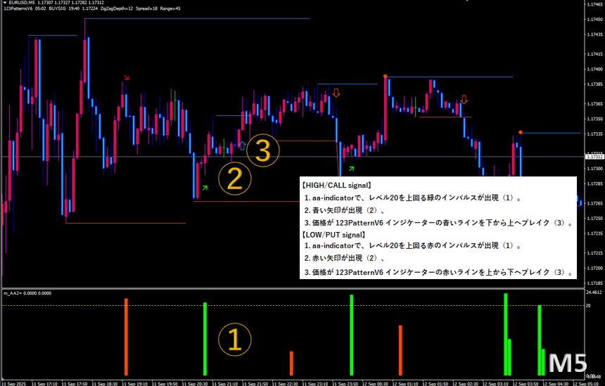 上記1~3を組み合わせて、ブレイク+勢いの一致 でエントリーを狙うバイナリー/短期デイトレ向けの合成システムです。