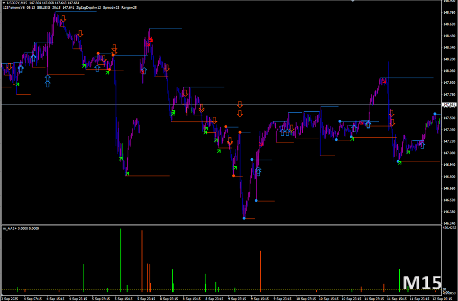 チャート上には上矢印(上昇示唆)・下矢印(下落示唆)、前回スイング由来の水平ライン、サブウィンドウにはオレンジ/グリーンの棒グラフ(閾値ライン付き)が表示され、「方向」「水準」「勢い」を一目で確認できます。