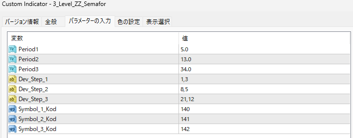 | Period3 | レベル3の期間 | 34.0 | 最も重い(大)セマフォの感度。大きいほど主要スイングのみを検出。 |