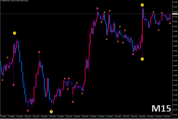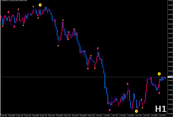ZigZag系ロジックで価格のスイング(山・谷)を検出し、3段階(1/2/3)の重要度で丸印(セマフォ)を表示するインジケーターです。