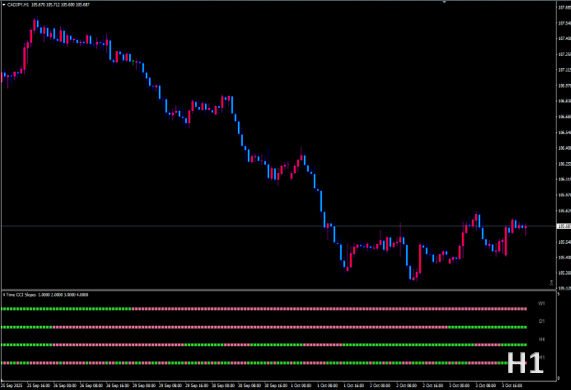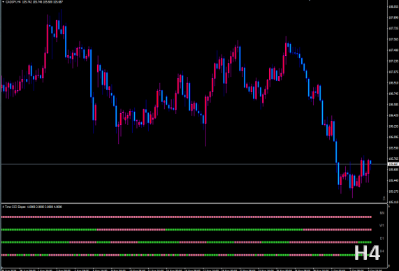 4 Time Frame CCI Slope nmc は、CCIの「傾き」を4時間足で同時に可視化し、