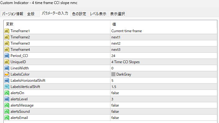 | UniqueID | 固有ID | 4 Time CCI Slopes | 同指標を複数設置するときの識別子。重複しない文字列に。 |