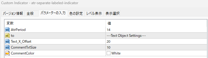 | CommentTxtSize | 10 | ラベル文字サイズ | 「Curr ATR / Prev ATR」などの表示文字のサイズ。 |