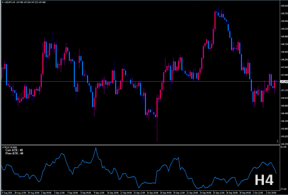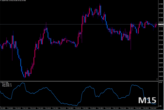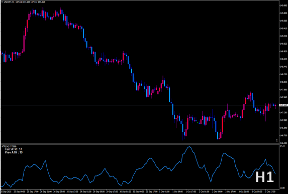 ATR(Average True Range=平均変動幅)をサブウィンドウにラインで表示し、左上に