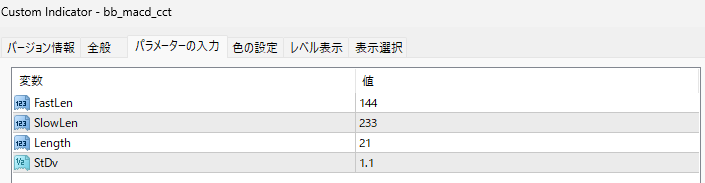 | FastLen | 144 | 短期EMA期間 | MACDの短期指数移動平均(EMA)の本数。小さいほど反応が速くなりノイズも増える。大きいほど滑らかで遅行。 |