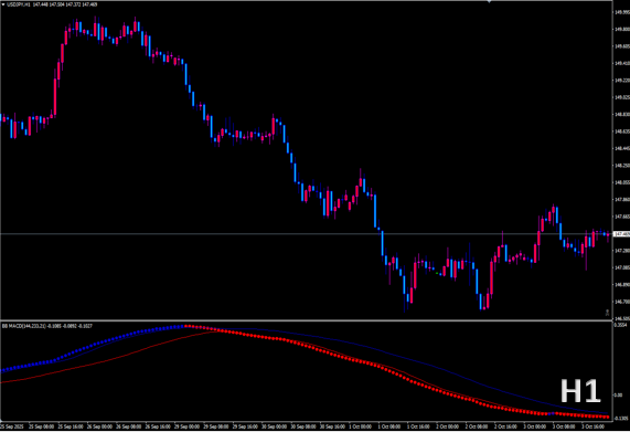 - 赤/青のドット=MACDヒストグラムの代用(ゼロライン周りに表示)