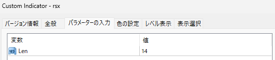 Len 14 期間(ルックバック) RSXを計算する過去バー本数。短い=機敏だがノイズ増/長い=滑らかで遅行。14は標準的なバランス。