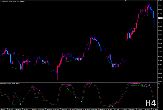 価格の高安更新とストキャスの高安更新が食い違う転換の前兆を、チャート上のライン(緑=強気、赤/ピンク=弱気)と矢印で表示します。