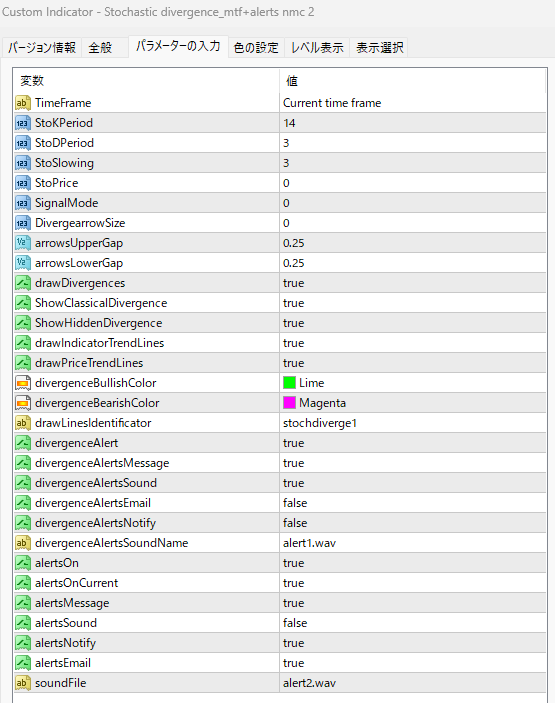 | drawLinesIdentificator | stochdiverge1 | 描画識別子 | 同系インジ併用時の衝突回避ID。 |