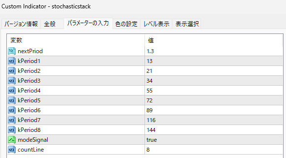 nextPriod 1.3 期間増加係数 各ストキャス%Kの期間を段階的に伸ばす倍率。短期→長期を自然な間隔で配置。