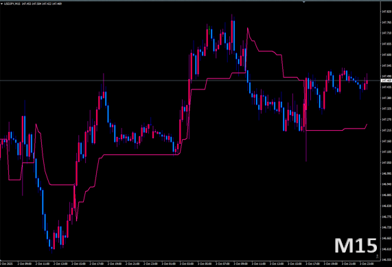• 価格がラインを終値でブレイクすると方向が反転(Stop & Reverse)し、新しい側にラインが出ます