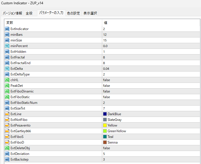 | ExtIndicator | 描画モード / 機能セット | 2 | ZUPの表示内容を切替(例:ZigZag+比率+パターン)。 2=標準のハーモニック検出一式を使うビルドが多い。 |