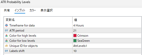 AtrLevels1 | ラインやラベルに付与する識別子。チャートに同インジの複数インスタンスを出す場合や、他の描画物と衝突させたくない場合に別のIDへ変更。 |