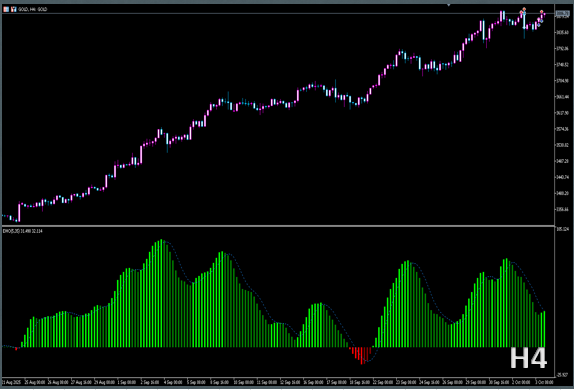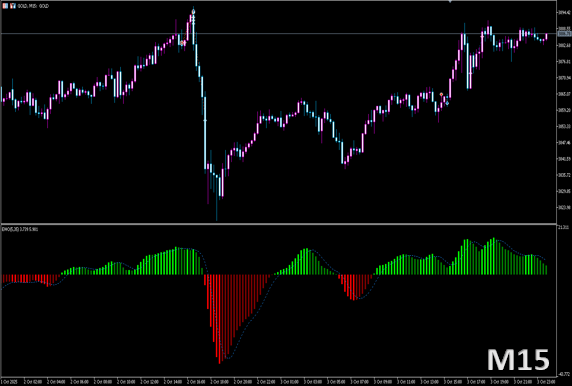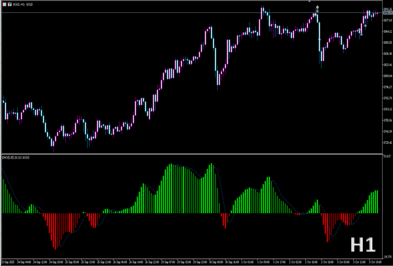 一般的に 短期移動平均(例:5)と長期移動平均(例:35)の差 をヒストグラムでプロットし、基準のゼロラインを上下する動きでトレンドと波動の勢いを可視化します。画像の下段がその典型(EWO(5,35)+点線のシグナルライン)。