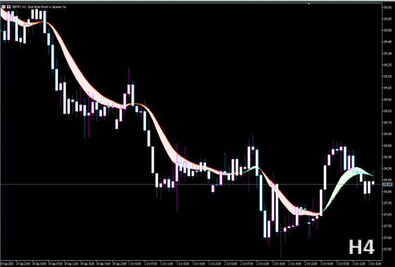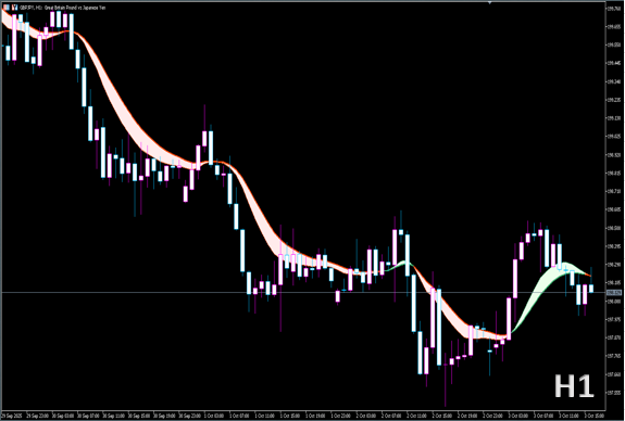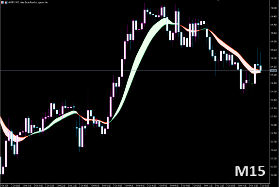 単純なEMAではなく、複数EMAや補正値を組み合わせて「リボン状」に表示し、相場の方向性や強弱を直感的に判断できます。