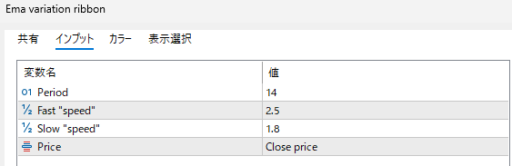 Period 14 期間 リボンの基礎となるEMAの本数。小さいほど反応は速いがノイズ増/大きいほど滑らかで遅い。