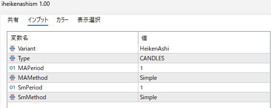 | Variant | バリアント(方式) | HeikenAshi | 計算方式の選択。ここでは標準の平均足。ビルドによっては“Smoothed/Modified”などが選べます。 |
