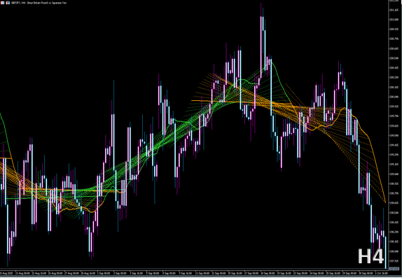 その回帰線(や±σの帯)を連続表示して“流れ(傾きの推移)”を可視化するインジケーターです。