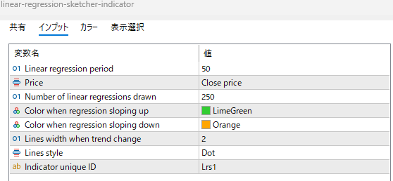 | Color when regression sloping up | 上向き傾きの色 | LimeGreen | 回帰線の傾きが正(上昇)になった区間の色。トレンドの強弱を視覚的に区別。 |