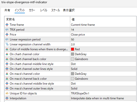 | Unique ID for objects | TRiXSlopeDiv1 | オブジェクトID | 同一チャートに複数挿す時の重複回避。 | IDを重複させない |