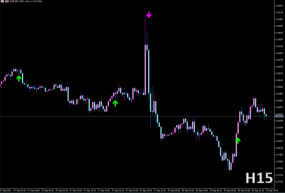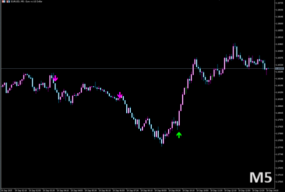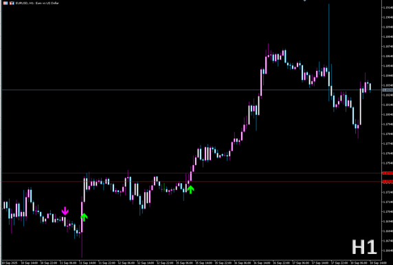 通常のオシレーター表示とは異なり、チャート上に 上向き矢印(買いシグナル)下向き矢印(売りシグナル) を直接描画するため、視覚的にわかりやすく、エントリータイミングの判断をサポートします。