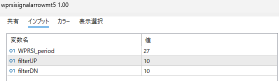 WPRSI_period 27 WPR+RSIの計算期間(中期寄り) 小さくすると感度↑・サイン増(ノイズ増)。大きくすると安定↑・サイン減。M15〜H1のバランス設定。