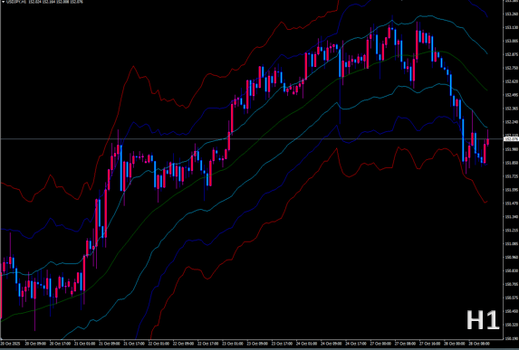 - ローソク足が下バンドを割り込む → 下落トレンド加速の兆候