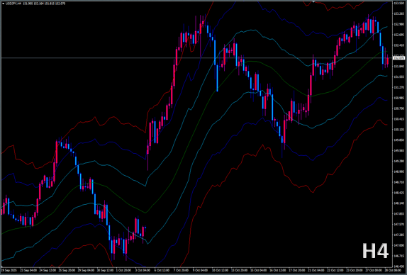最外側のチャンネル(バンド3)の幅を決める係数です。 「4.8 × ATR」という非常に広いエリアが描かれるため、ここにタッチ・ブレイクする動きは “異常レベルの加速/過熱” とみなすことができます。 短期逆張りエントリーや利確ポイントの判断に使われます。 |