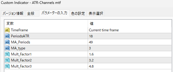 2つ目のチャンネル(バンド2)の幅を決める係数です。 ここでは「3.2 × ATR」の距離に描かれるため、かなり大きめの値動きまでカバーします。 トレンドが継続しているか、それとも行き過ぎているかを判断する目安になります。 |