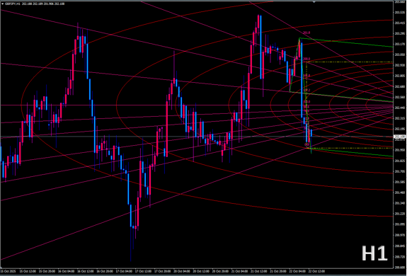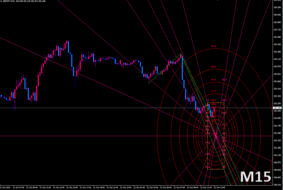 - 黄金比の角度線(フィボナッチ・ファン)で時間の転換リズムを予測。