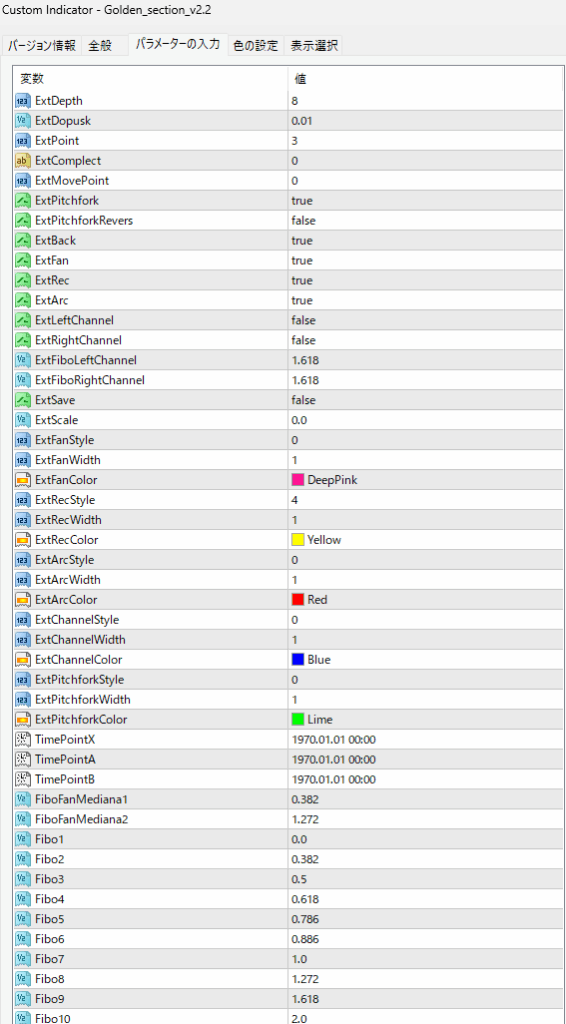 Golden_section_v2.2(ゴールデン・セクション)は、数学的に有名な「黄金比(1:1.618)」をベースにしたフィボナッチ系の分析ツールです。
