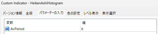 AvPeriod 平均期間(Average Period) 6 ヒストグラムの平滑化期間。数値を小さくすると感度UP(ノイズ増)、大きくすると滑らかで安定(反応遅延)。