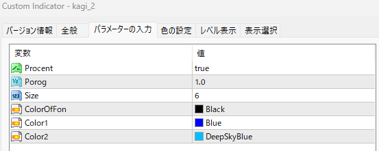 Size ライン太さ 6 チャート上に描かれるKagiラインの太さ。視認性を高めるための設定値です。