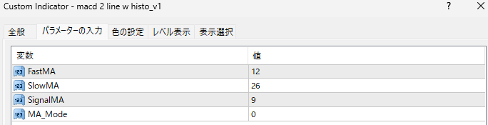| SignalMA | シグナル線(SMA) | 9 | MACDラインの平均を取って描かれるシグナル線です。 MACDラインと交差(クロス)することで売買サインが発生します。 値を小さくすると反応が早く、値を大きくすると滑らかになります。 |