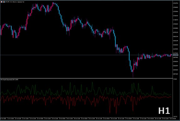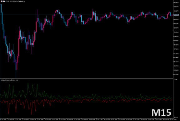 使い方メモ: 緑線(下ヒゲ)が急伸=反発買いの強化、赤線(上ヒゲ)が急伸=戻り売りの強化。 両線が同時に拡大する局面はボラティリティ上昇(ブレイク前兆)に注意。