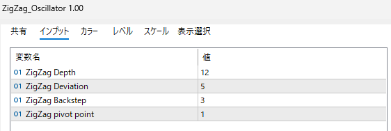 ZigZag Deviation 許容誤差(偏差) 5 転換点を検出する際の許容範囲。